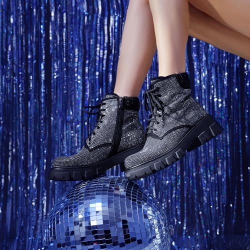 Wavyvigs Rhinestone Combat Boots Platform Chunky Heel Lace Up Ankle Boots Side Zipper